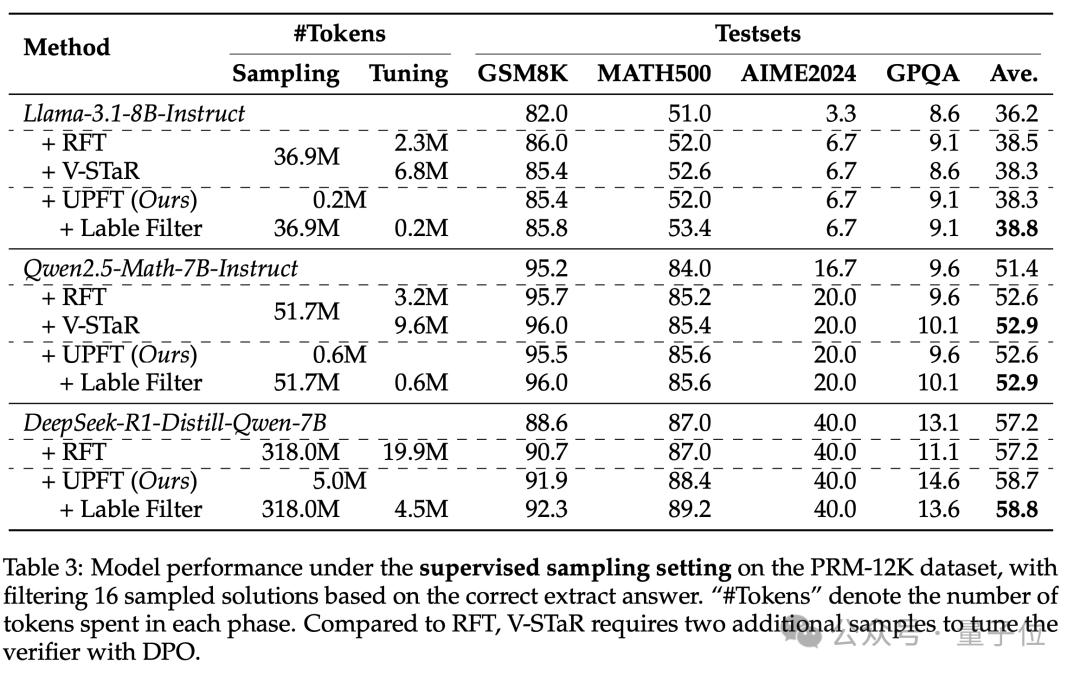 同时UPFT在DeepSeek-R1-Distill-Qwen-7B上飙到58.7%,比RFT高1.5个点,采样token的花费却只需要RFT的1%,训练token花费仅为RFT的25%。