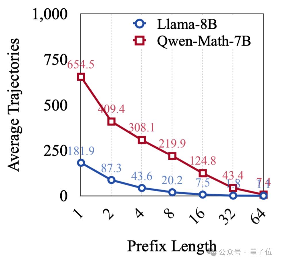并且随着前缀长度的增加,每种推理前序所对应的平均推理路径数量逐渐减少,AI生成的解题方案开始呈现出“分化”的趋势。