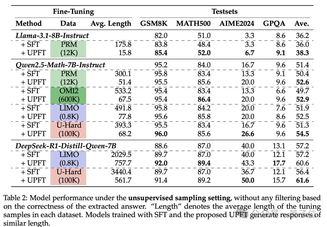 结果表明,与传统的监督微调(SFT)相比,UPFT在多个方面表现出色: