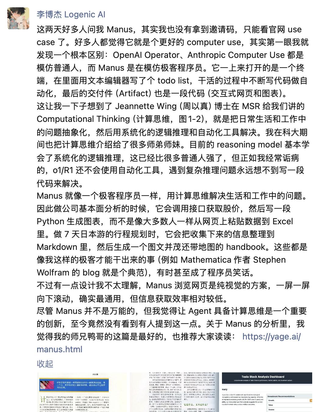 华为天才少年、Logenic AI 创始人李博杰认为 Manus 有一眼不同于其他产品的厉害之处:以极客程序员的方式解决问题。|图片来源:微信截图