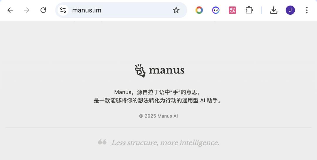 在 Manus 官网的最底部,悄悄呈现了 Manus 背后最重要的发现:「Less Structure,More intelligence」。|截图来源:Manus