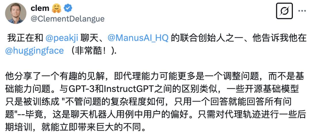Hugging Face 创始人、CEO Clement Delangue 在 X 平台提出 Peak 的发现值得思考:智能体的能力不是卡在基座模型上,而是像 GPT-3 与 InstructGPT(ChatGPT)的差别一样,是对齐的问题。一些开源基础模型被简单训练成「无论问题的复杂程度如何,都能在一个轮次中回答完所有问题」,但这是聊天机器人场景中的要求,只需要对智能体的路径做一些后训练,就能立即带来巨大的不同。|截图来源:X