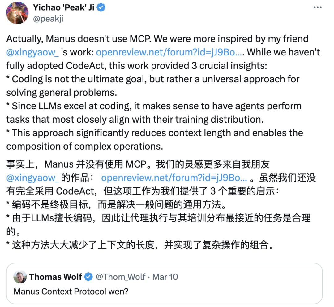 Manus 并未引入 MCP(《模型上下文协议》),而是让 AI 能够自己写代码去调用 API,来胜任各种各样长尾任务。|截图来源:X