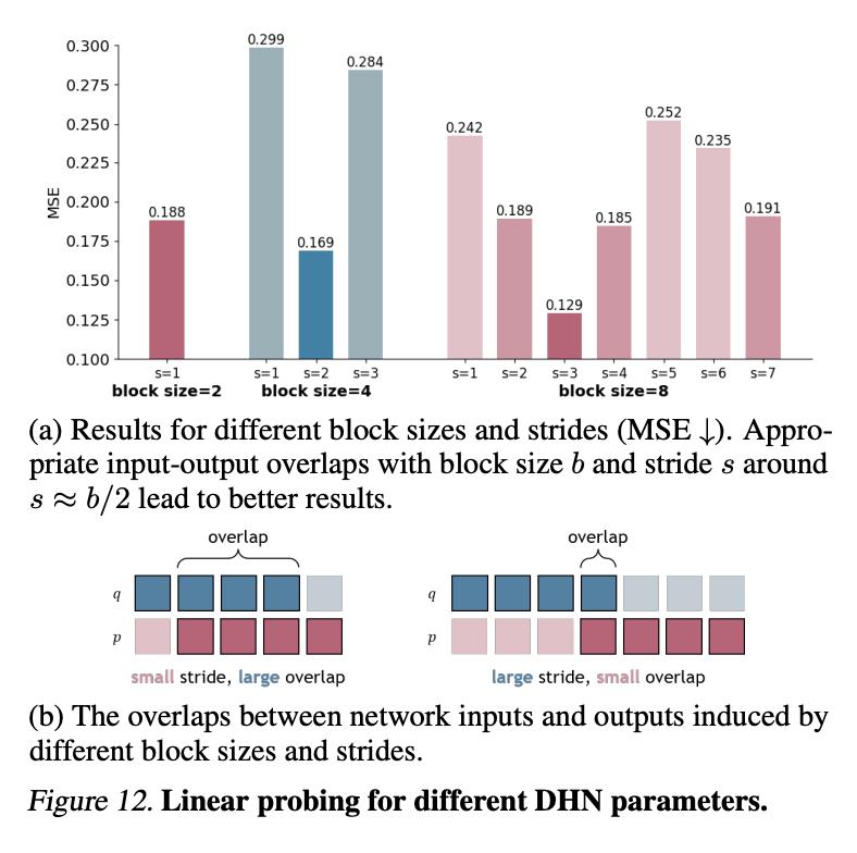 图 12 展示了不同块大小和步长的 DHN 结果。如图 12b 所示,哈密顿块的输入和输出状态有一个 b-s 时间步长的重叠区域。哈密顿块的广义能量守恒依赖于重叠区域具有相同的输入和输出。在训练过程中,这一约束作为状态预测损失的一部分强加给网络。较大的重叠会对网络施加更强的正则化,但会鼓励网络执行更多的自一致性约束,而不是更多的状态间关系。相反,减少重叠度的同时增加跨度,可以鼓励模型吸收更多时间上较远的状态信息,但代价是削弱自洽性约束,从而影响稳定性。在重叠等于块大小 b 且跨度为零的极端情况下,DHN 块的输入和输出完全相同,训练损失退化为自相干约束。HNN 是另一种重叠为零的特殊情况(因为块大小为 1,重叠只能为零)。如 12b 所示,对于简单双层 transformer,最佳的块大小和跨度约为 s≈ b/2,重叠量适中。