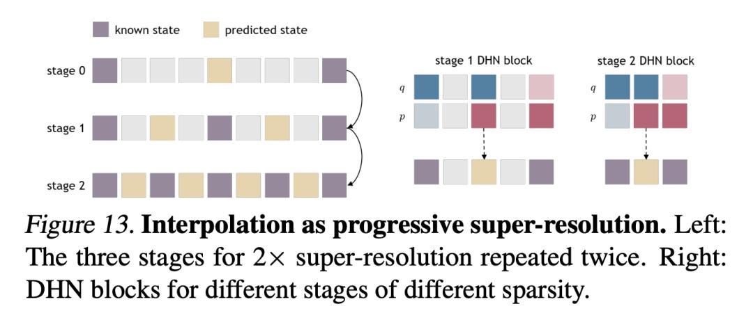 研究者通过重复应用 2 倍超分辨率来实现 4 倍超分辨率。如图 13 左所示,为每个阶段构建一个 b = 2、s = 1 的 DHN 块。不同稀疏度的轨迹块如图 13 右所示。掩码应用于中间状态,边上的两个状态是已知的。