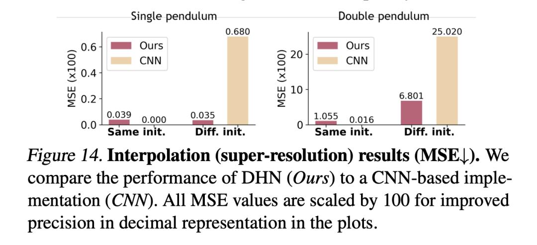 最后,研究者将本文模型与用于超分辨率的 CNN 进行了比较,结果如图 14 所示。对于与训练数据具有相同初始状态的轨迹,两个模型都显示出较好的插值结果,MSE 也较低。基线 CNN 的结果稍好,因为它本身没有正则化,很容易过拟合训练轨迹。对于具有未知初始状态的测试轨迹,CNN 难以实现泛化,因为其插值在很大程度上依赖于训练分布。相比之下,DHN 具有很强的泛化能力,因为其物理约束表征使其即使在分布变化的情况下也能推断出可信的中间状态。