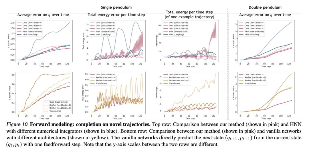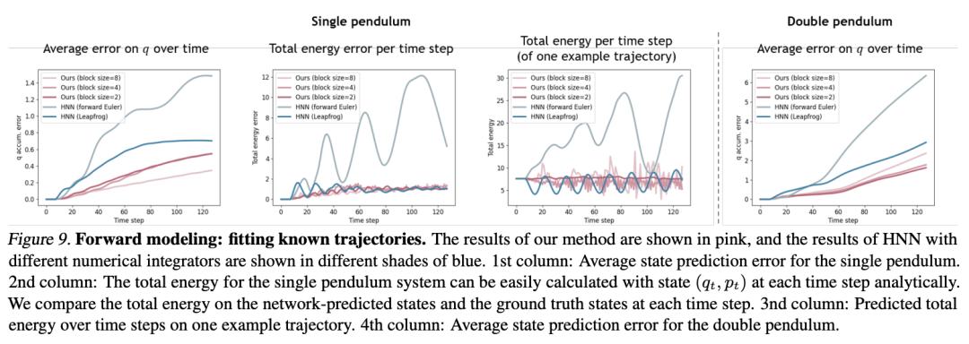 图 9 显示了采用不同块大小的模型与采用不同数值积分器的 HNN 的比较结果。左图和右图分别是单摆和双摆系统在每个时间步的 q 预测值的均方误差(MSE)。中间的图显示了一个示例轨迹上的平均总能量误差和总能量的演变。对于 DHN,每个时间步的状态优化由去噪机制建模,无需变分积分器。当块大小为 2 时,本文的模型可以稳定地保存总能量。增加块大小会在较长的时间范围内引起能量波动,但这种波动并没有表现出明显的能量漂移倾向。