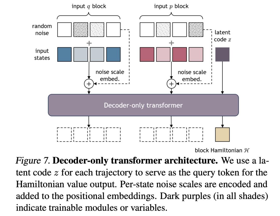 作为长度为 2b + 1 的序列应用了自注意力。全局潜码 z 作为查询 token,用于输出哈密顿值 H。还通过在位置嵌入中添加每个状态的噪声标度,将其编码到网络中。在实验中,研究者实现了一个适合单 GPU 的简单双层 Transformer。