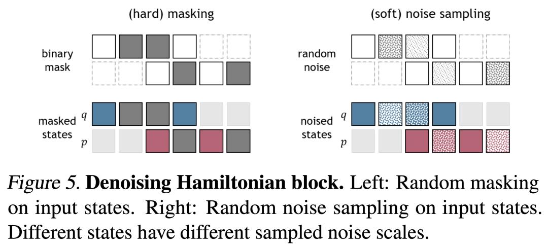 掩码建模和去噪。研究者希望哈密顿块不仅能对跨时间步的状态关系进行建模,还能学习每个时间步的状态优化,以便进行推理。为此,他们采用了掩码建模策略,在训练网络时屏蔽掉部分输入状态(图 5)。