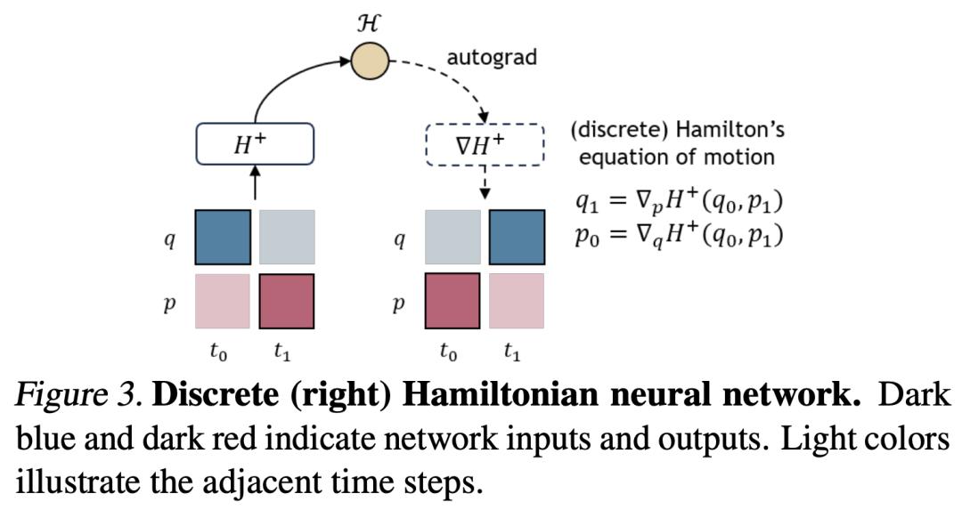 图 3 展示了一个离散的哈密顿网络(右),用于计算时间步长 t_0 和 t_1 之间的状态关系。研究者主要使用哈密顿 H^+(右)来描述他们的网络设计。