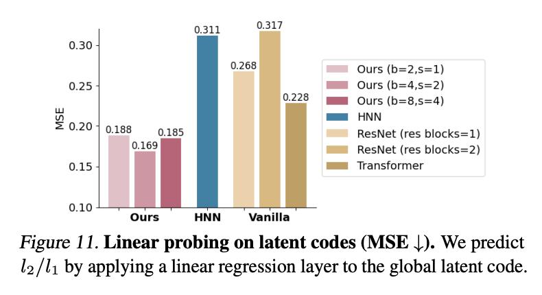 图 11 展示了与 HNN 和常规网络相比,DHN 在不同块大小(s = b/2)下的线性探测结果。与基线网络相比,本文的模型实现了更低的 MSE。如图 4 所示,HNN 可以看作是哈密顿块的特例,其核大小和步长均为 1,具有最强的局部性。研究者引入的块大小和跨度允许模型在不同尺度上观察系统。在这个双摆系统中,块大小为 4 是推断其参数的最佳时间尺度。