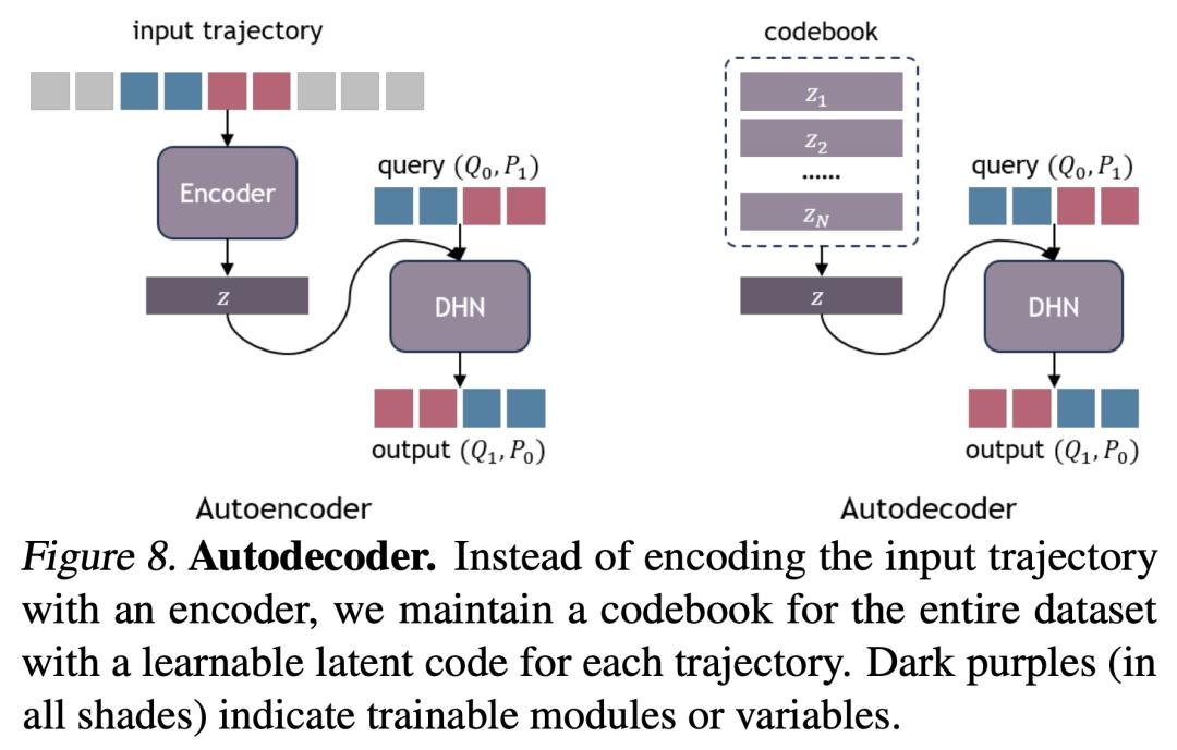 自解码。研究者没有依赖编码器网络从轨迹数据中推断全局潜码,而是采用了自解码器框架,为每条轨迹维护一个可学习的潜码 z(图 8)。这种方法允许模型高效地存储和完善特定系统的嵌入,而不需要单独的编码过程。在训练过程中,研究者会联合优化网络权重和代码库。训练结束后,给定一个新轨迹,冻结网络权重,只优化新轨迹的潜码。