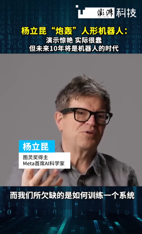 快科技3月15日消息,近日,图灵奖得主、Meta首席AI科学家杨立昆在一档播客节目中“炮轰”人形机器人,