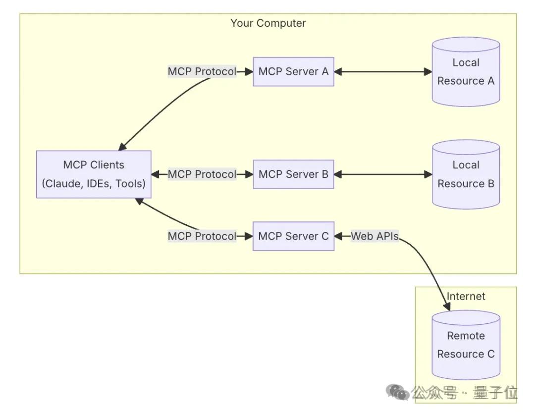 MCP服务器还内置了安全机制,允许服务器自己控制资源,不用把API密钥交给大模型。
