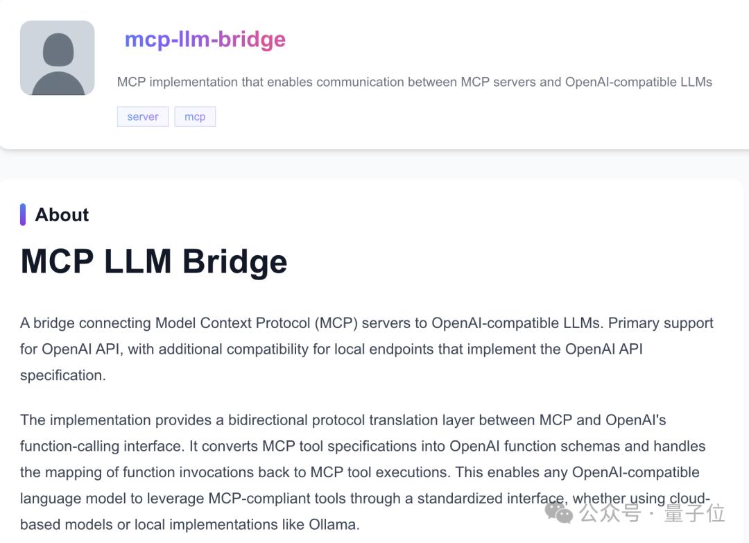 有意思的是,大模型也是可以被“MCP服务化”的,比如让服务器通过OpenAI兼容API调用其他模型。