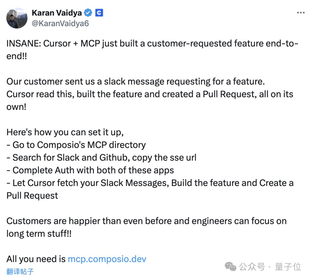 有人在Cursor上使用MCP协议同时接入了Slack和GitHub,完成了一次新功能开发。