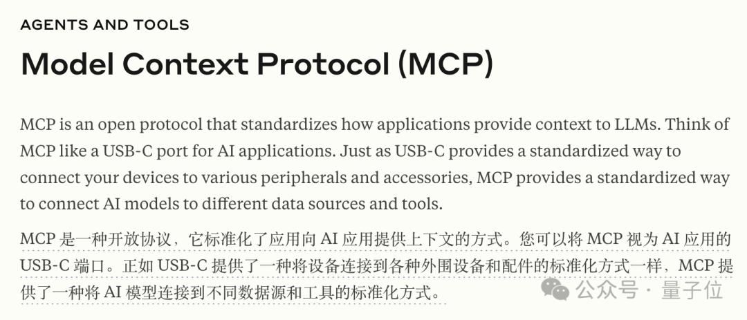 MCP是一种通信协议,是Anthropic提出的,现在Anthropic把它比喻成AI应用的Type-C接口。