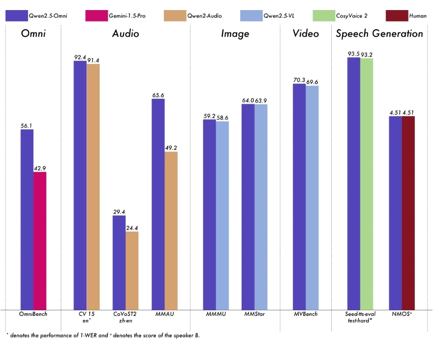 全模态性能优势:在同等规模的单模态模型进行基准测试时,表现出卓越的性能。Qwen2.5-Omni在音频能力上优于类似大小的Qwen2-Audio,并与Qwen2.5-VL-7B保持同等水平。