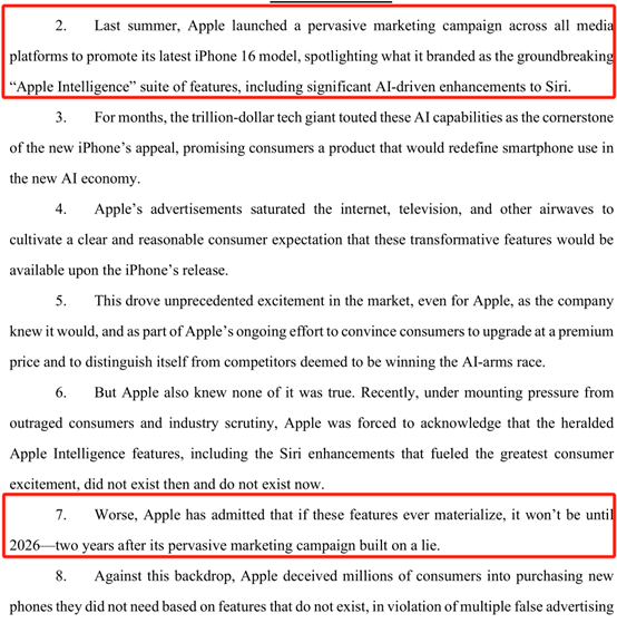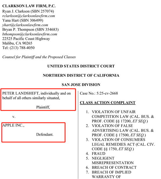 根据美国加利福尼亚州北部地区法院圣何塞公开的一份诉讼书显示,Peter Landsheft以个人名义并代表所有购买了苹果 iPhone 16 系列产品的消费者提起集体诉讼,起诉苹果虚假宣传其手机的AI功能。