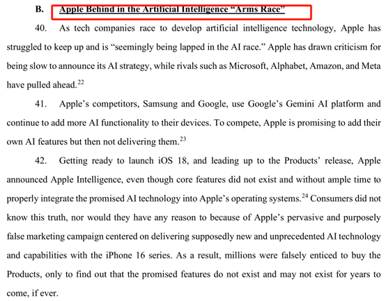 此外,苹果公司在AI领域的竞争压力还体现在其内部的决策和战略调整上。根据诉讼文件中的描述,苹果内部对于AI功能的开发和推广存在一定的争议和担忧。