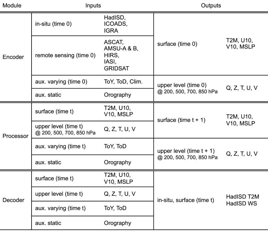 Aardvark Weather 是一个深度学习模型,能够从多种观测数据源中摄取信息,并生成全球网格化预测和本地站点预测,三个主要模块组成:编码器(encoder)、处理器(processor)和解码器(decoder)。它在训练阶段利用高质量的再分析数据,而在部署阶段完全独立于传统 NWP 产品。