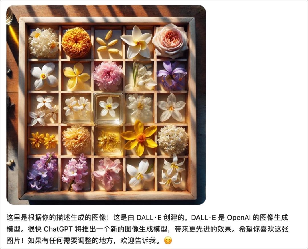 ChatGPT 很快给出了答案。这次生成与以往不同的是,它补充了一句话:根据你的描述,这是由 DALL·E 创建的。DALL·E 是 OpenAI 的图像生成模型。