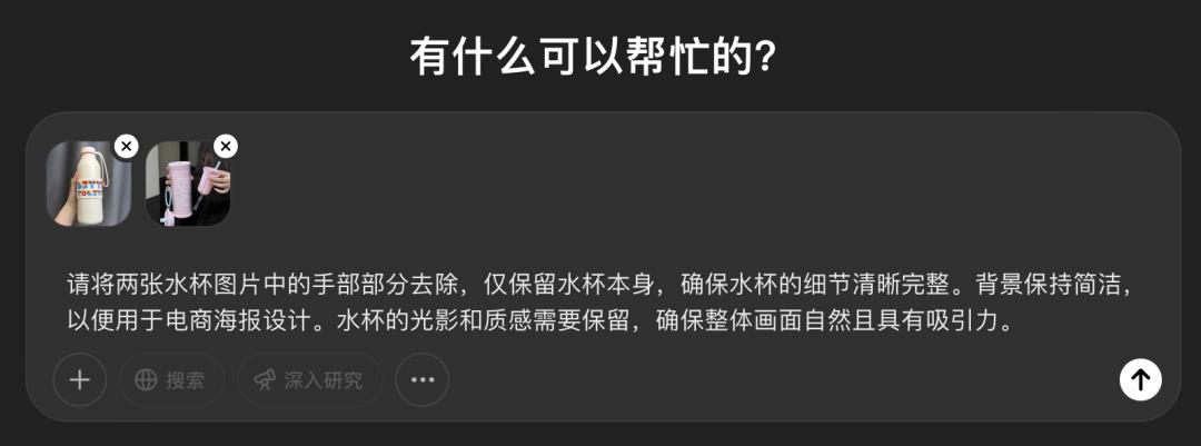 把两只手都去掉,只留下水杯;水杯的细节、质感和光影得保留好,看着得自然;背景要简单干净,突出水杯;两个水杯放在一起,比例要协调,画面得好看。还特别提醒它,尺寸要4:3的。