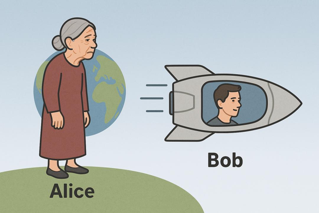 生成一张图,展示两个人:Alice 在地球上,Bob 在高速飞行的宇宙飞船里。因为相对论的时间膨胀效应,Bob 看起来比 Alice 年轻。地球上 Alice 在慢慢变老,而飞船里的 Bob 几乎没变。背景简单,比例4:3。