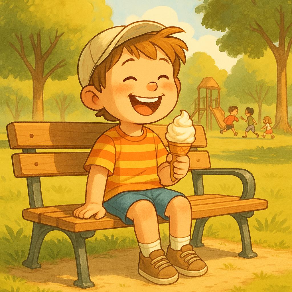 内容是一个阳光明媚的下午,一个小男孩坐在公园的长椅上,手里拿着一个冰淇淋,脸上露出开心的笑容。