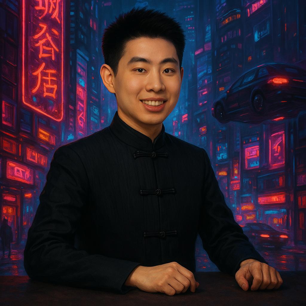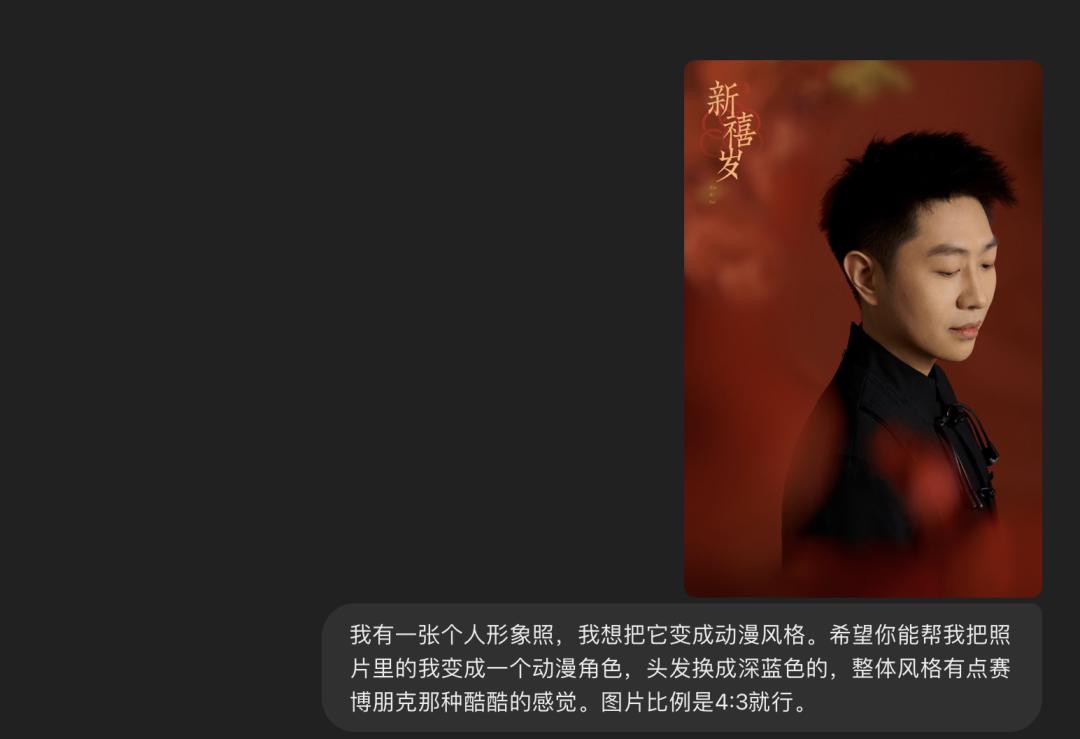 比如:我有一张个人形象照,我想把它变成动漫风格。希望你能帮我把照片里的我变成一个动漫角色,头发换成深蓝色的,整体风格有点赛博朋克那种酷酷的感觉。图片比例是4:3就行。