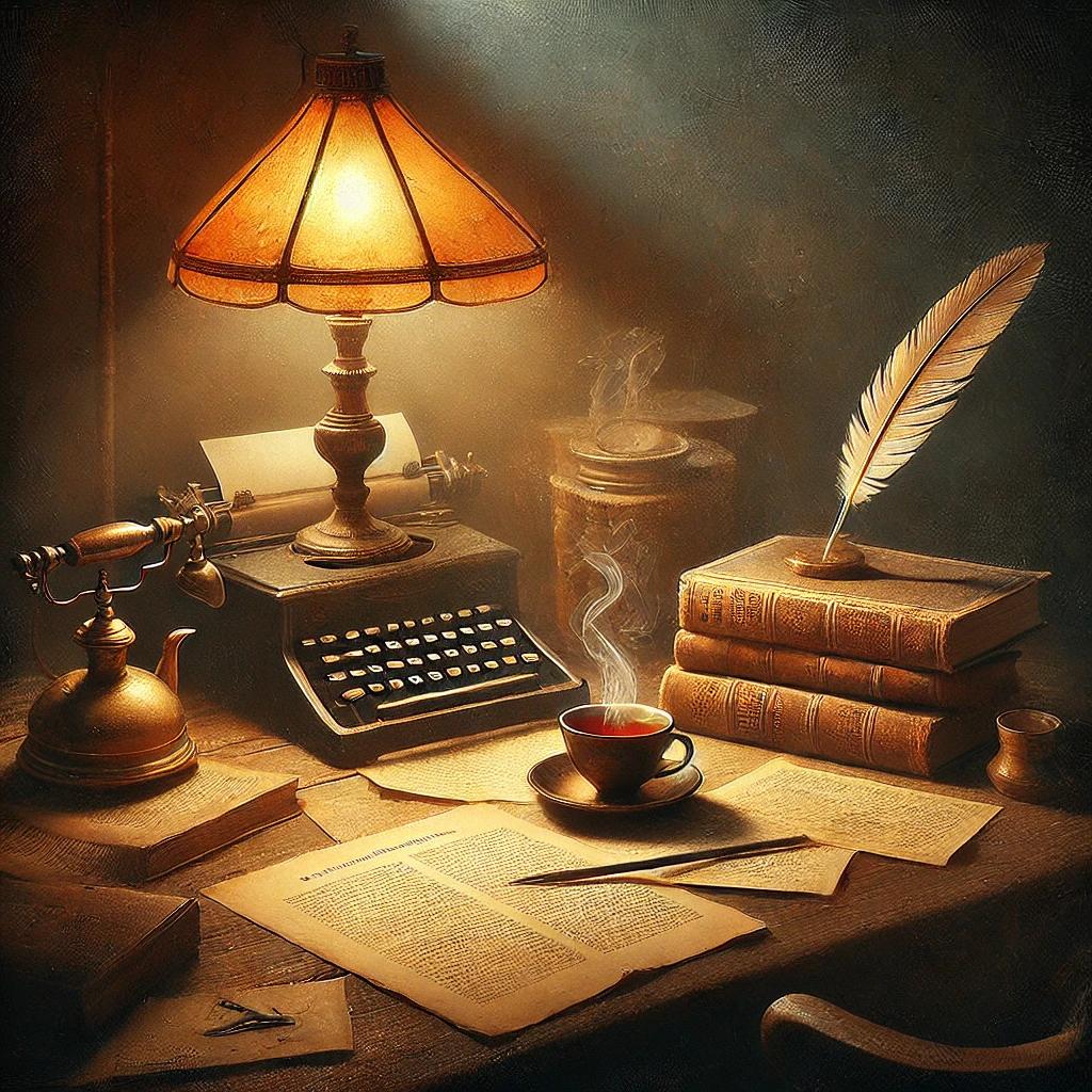 在昏暗的复古书房里,一盏台灯散发着柔和的暖光,照亮了一张古老的木质书桌。书桌上散落着几本泛黄的书籍和一支羽毛笔,旁边是一杯冒着热气的红茶。画面采用油画风格,营造出宁静而怀旧的氛围,仿佛时间在这里静止。