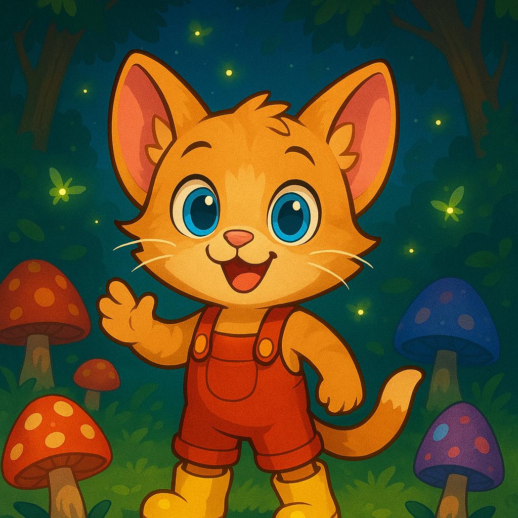 一个活泼可爱的卡通小猫,有着大大的蓝色眼睛和柔软的粉色耳朵,身上穿着一件红色的小背带裤,脚上蹬着一双黄色的小靴子。