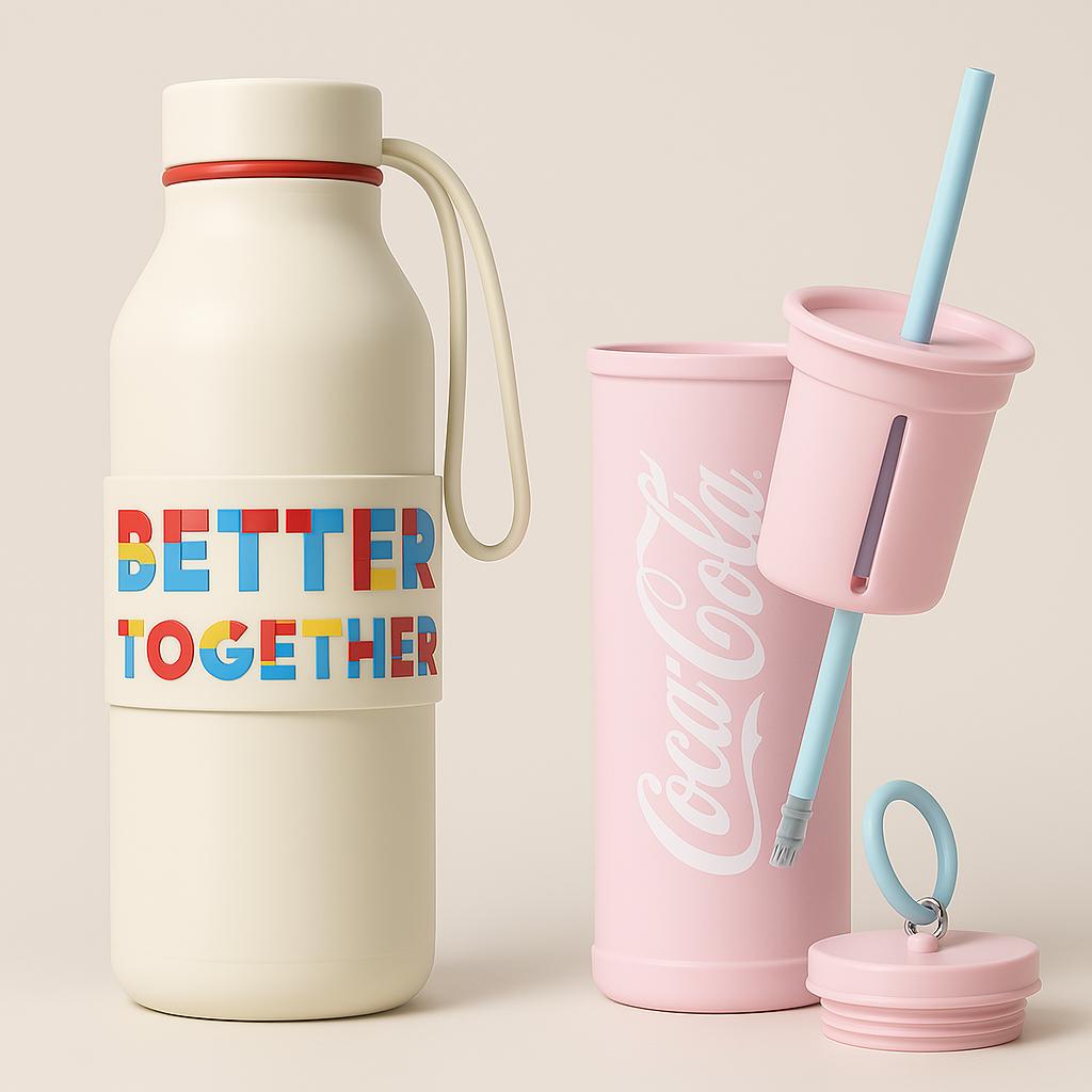 请将两张水杯图片中的手部部分去除,仅保留水杯本身,确保水杯的细节清晰完整。背景保持简洁,以便用于电商海报设计。水杯的光影和质感需要保留,确保整体画面自然且具有吸引力。