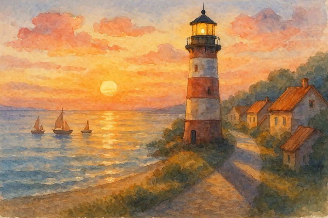 在一片宁静的海边小镇,夕阳的余晖洒在古老的灯塔上,灯塔的影子拉得很长。远处的海面上,几艘小船在金色的波光中缓缓航行,天空中飘着几朵粉色的云。画面采用水彩画风格,色彩柔和而温暖,营造出一种宁静而梦幻的氛围。