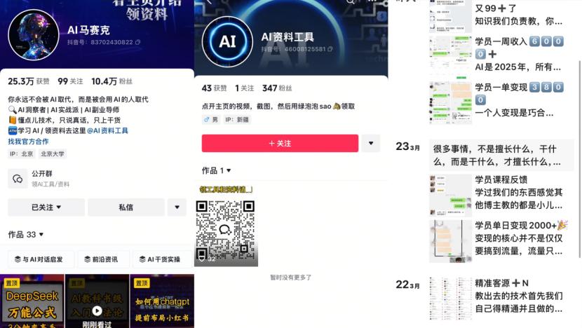 另一边,陷入涨粉瓶颈期的升阳反而有了新发现。之前,正是“AI马赛克”中那些面向普通人的AI工具使用教程,让他下定决心做短视频。如今再看,升阳留意到这个当初粉丝量仅3万多的账号,在一个月内粉丝量已经涨到了10.5万。而从其一条视频教学演示能看出,部分视频文案和脚本是用DeepSeek生成的。而且,升阳还发现该账号主页介绍中有获取AI资料工具的微信二维码,扫码进入朋友圈,满是和学员交流课程、展示收入的聊天截图。