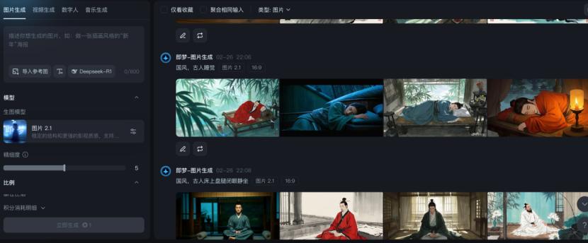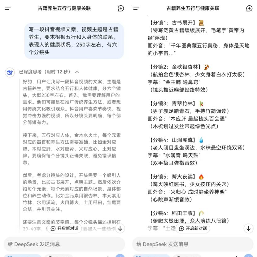 不过,除了以上原因,吸引升阳开干的还有简单易上手。这种视频制作全程只需要DeepSeek、即梦AI和剪映三个工具,具体操作是:先通过DeepSeek生成中式养生视频文案以及相应的文案镜头脚本;再将DeepSeek生成的文案镜头提示词粘贴到即梦AI的文生图对话框中,生成满意的国风图片后,选择将其生成视频;生成所有的镜头视频后,将其导入剪映中,选择合适的配音后导出,一条完整的中式养生视频就生成了。