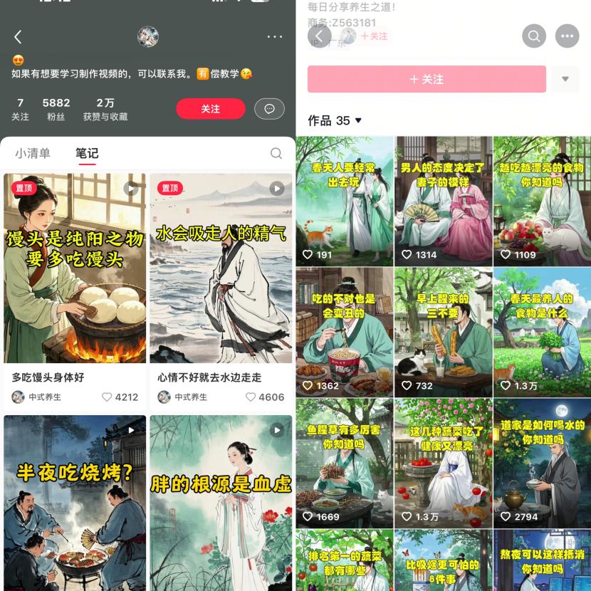对此网上也有不少分析:一方面中式养生赛道拥有从年轻人到中老年人极为庞大的受众群体,另一方面,结合水墨风格画面和古风音乐生成的养生知识视频,比较符合大众的审美,因而能有着不错的播放量。