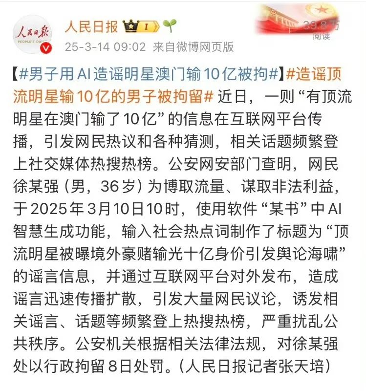 公安部通告称,“网民徐某强(男,36岁)为博取流量、谋取非法利益,于2025年3月10日10时,使用软件“某书”中AI智慧生成功能,输入社会热点词制作了标题为‘顶流明星被曝境外豪赌输光十亿身价引发舆论海啸’的谣言,公安机关根据相关法律法规,已对徐某强处以行政拘留8日处罚。”
