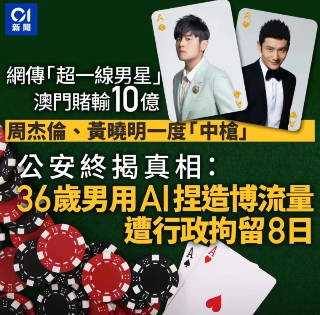 “顶流男星豪赌10亿”就来自某网友手笔,该网友使用AI软件输入社会热点词,制作了标题为‘顶流明星被曝境外豪赌输光十亿身价引发舆论海啸’的谣言信息,并在小红书、微博等社交平台迅速扩散,目前已被处以行政拘留8日处罚。