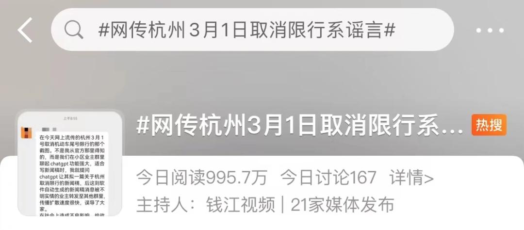 随后“江浙之声”报道,这则所谓的“新闻”,是杭州某小区业主群讨论ChatGPT,一位业主开玩笑,称试试用ChatGPT写“杭州取消限行”的“新闻”,并在群里直播ChatGPT写作的全过程,其他看到文章的业主直接当成新闻截图转发。