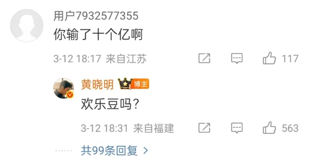 网友吃瓜热情被迅速点燃,相关帖子开始在微博、小红书、豆瓣、知乎等社交平台大肆传播,林俊杰、周杰伦等“顶流男星”都被提及,甚至还有网友跑到黄晓明微博下方求证是否输了十亿,得到对方“欢乐豆吗?”的回答。
