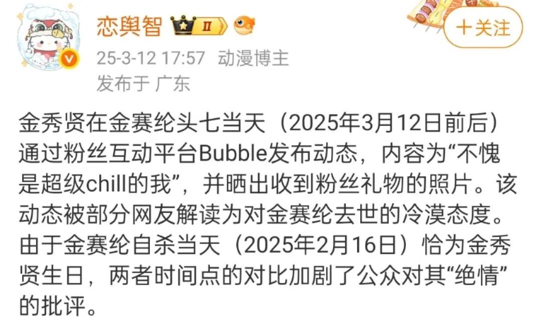 3月12日,微博名为“恋舆智”的网友发布微博,称金秀贤在金赛纶头七当天(2025年3月12日前后)通过粉丝互动平台Bubble发布动态,晒出粉丝礼物,并称“不愧是超级chill的我”。