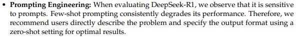 我们还翻了一下DeepSeek-R1的官方技术报告,他们在论文里也这么说:“DeepSeek-R1 对提示词很敏感,举例提示反而会降低模型表现。"