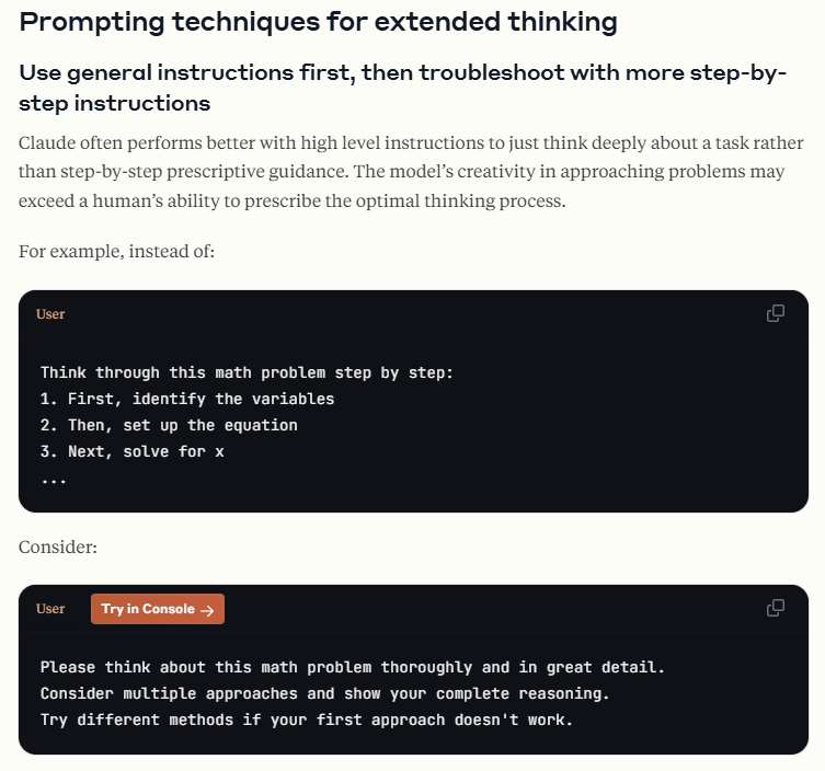 除了GPT和DeepSeek,Claude 3.7 Sonnet也在官方文档中表示,比起那些看似很有逻辑,每一步都详细列出具体做啥的提示词,他们更希望你直接使唤它。