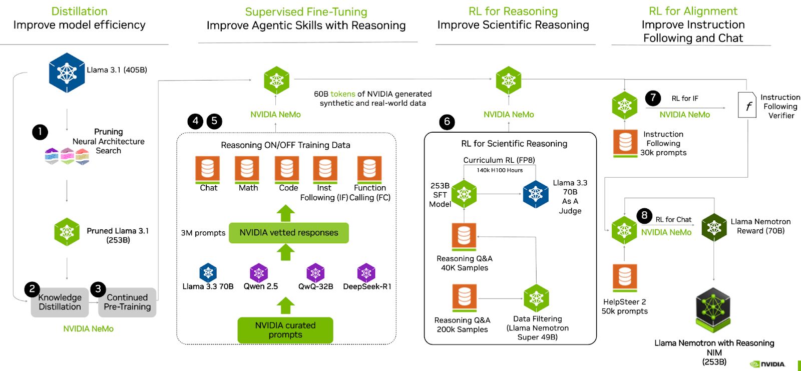 在部署效率上,Nemotron Ultra 也实现突破。它能在单 8xH100 节点上运行推理,显著降低数据中心成本,提升企业开发者的可及性。