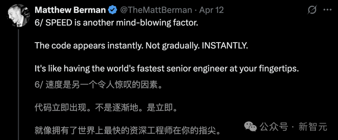 最关键的是,代码生成速度令人惊叹,这体验就像随时召唤一位世界顶级工程师。