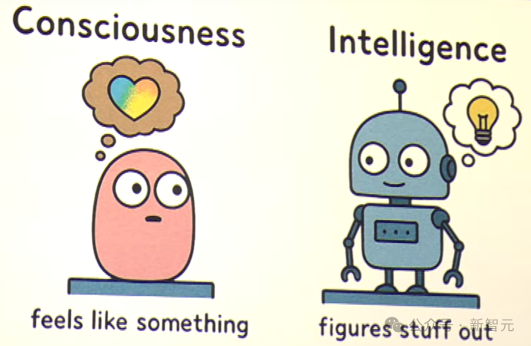 Anderson表示这图画的还不错,至少是个B+。接着他又展示了一张图片,这次他让Sora描绘一下智能和意识的区别。