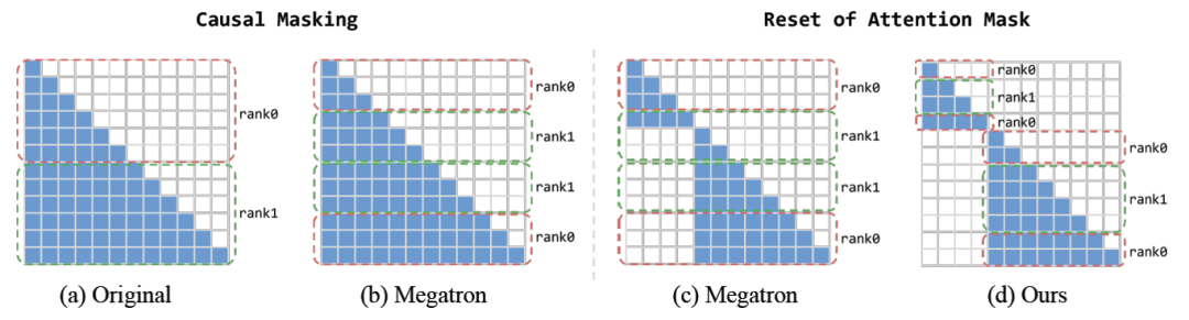 上下文并行(Context Parallelism,CP)是长序列训练中常用的优化方法。为了实现 CP 切分下的负载均衡,Megatron-LM 将序列切分为 2×CP 个子序列,每个设备负责计算上下两个 chunk 的数据(见图 1.(b))。然而,这种切分方式在重置 Attention Mask 的场景下仍会导致负载不均(见图 1.(c))。Pangu Ultra 采用了改进的子序列切分并行方式,针对每个样本中的子序列采用负载均衡的切分策略,每个节点负责计算子序列中的两个 chunks(见图 1.(d))。