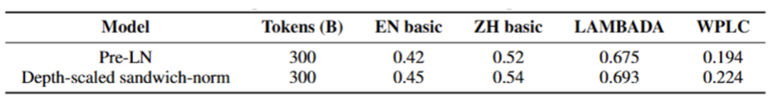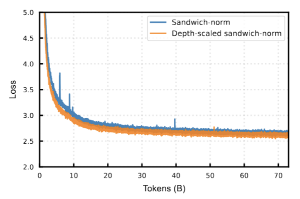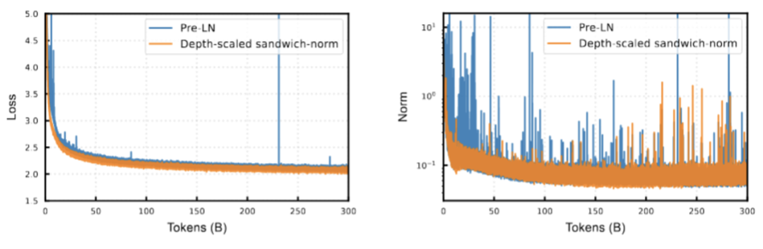 Depth-scaled sandwich-norm:与混合专家模型(MoE)侧重在宽度上扩展不同,大规模稠密模型通常采用更深的层数。然而,深度增加会加剧训练稳定性的挑战。考虑到预训练的巨大成本,保证大模型的稳定训练至关重要。