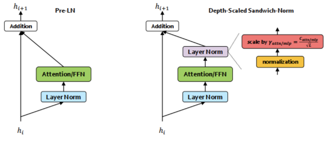 Pre-LN 与 DSSN 架构对比。相比 Sandiwich norm,DSSN 对 layer norm 系数做了特殊的 re-scale
